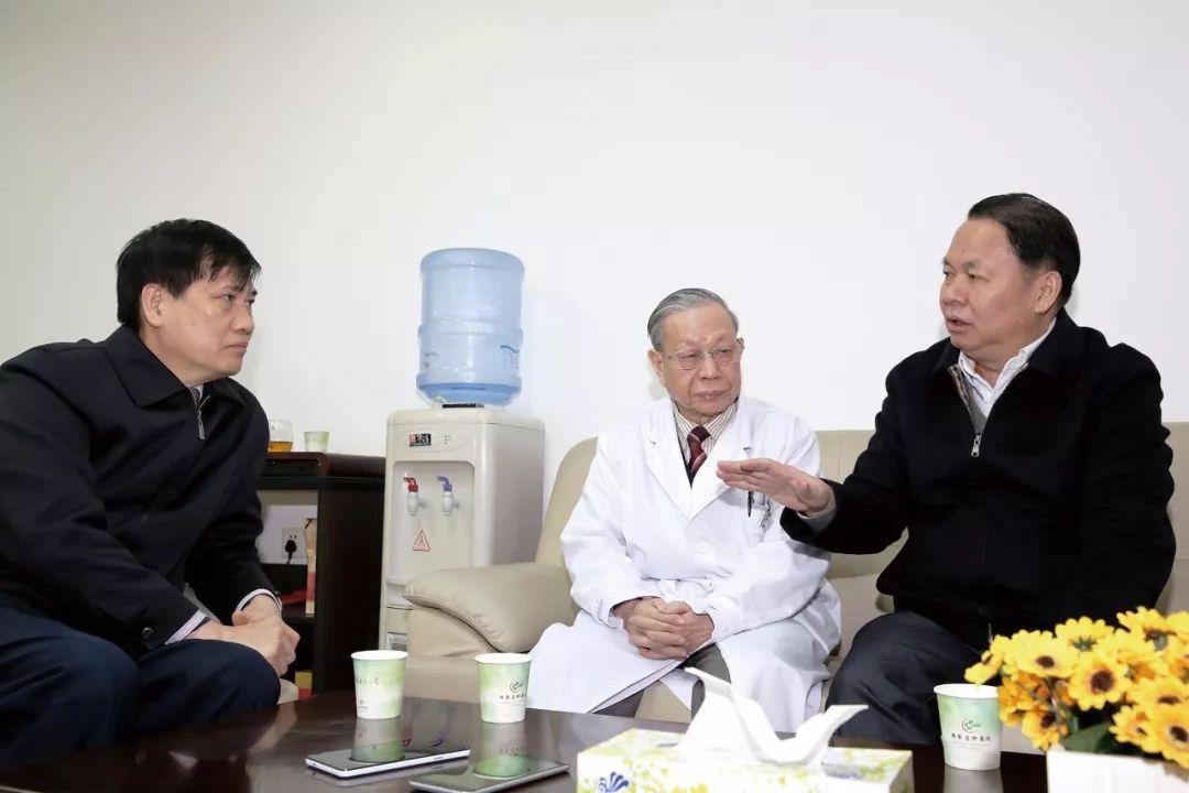 2017年1月2日,广东省卫生计生委副主任、省中医药局局长徐庆锋(右)看望国医大师禤国维(中),左为陈达灿
