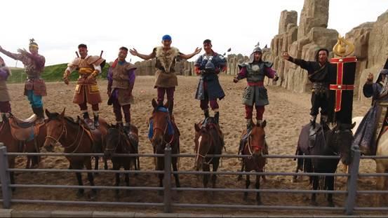 希拉穆仁草原上的牧家乐大概有两百多家。除了特色蒙古包的餐饮和住宿,每家的游乐项目也都大同小异。你可以选择传统的骑马看风景、也可以驾驶越野摩托车感受天地间的飞扬。或者去敖包祭拜,或者去牧民家作客,游客们可以根据自己的喜好,选择性的花费几百甚至上千元来参加不同的娱乐体验项目。在这里,你能看到不一样的风景,也能找到不一样的自己。在众多可选的娱乐项目当中,有一项是来这儿的所有游客几乎都会去体验的必选项目,那就是去红格尔敖包看一场震动人心的马术实景演出。这场演出分为四幕,一共四十五分钟。再现了八百多年前、成吉思汗时期蒙古民族那达慕的盛况以及蒙古人挥刀跃马、建功立业的历史传奇。
