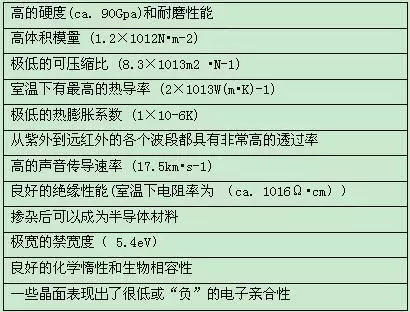 金刚石是自然界存在的特殊材料之一,具有最高的硬度、低摩擦系数、高弹性模量、高热导、高绝缘、宽能隙、高的声传播速率以及良好的化学稳定性等,如下表。虽然天然金刚石具有这些独一无二的特性,但是它们一直仅仅是以宝石的形式存在,其性质的多变性和稀有性极大地限制了其应用。而洛阳誉芯金刚石制备的CVD金刚石膜将这些优异的物理化学性能集一身,且成本较天然金刚石低,能够制备各种几何形状,在电子、光学、机械等工业领域有广泛的应用前景。