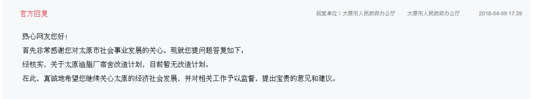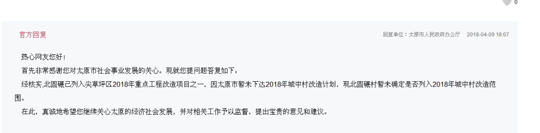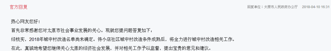 市长答复:经核实,2018年城中村改造名单尚未确定。待小店社区城中村改造条件成熟后,将全力进行城中村改造相关工作。