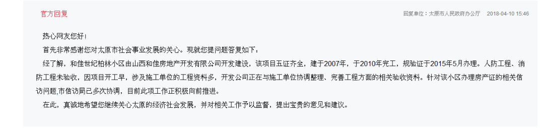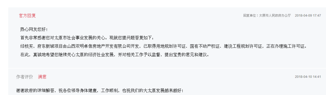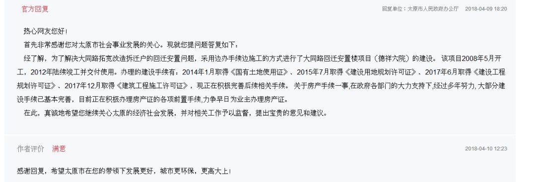 4月10日,人民网地方领导留言板中,对大家关心的北固碾村是否有*迁拆**计划;小店村是否整改;和佳世纪柏林和林溪森园大红本什么时候办下来等问题,太原市市长耿彦波给出了最新答复。