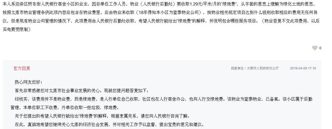 市民咨询:迎泽区桥东街人民银行宿舍小区的业主咨询,物业 收取1.29元/平米/月的“绿地费”问题