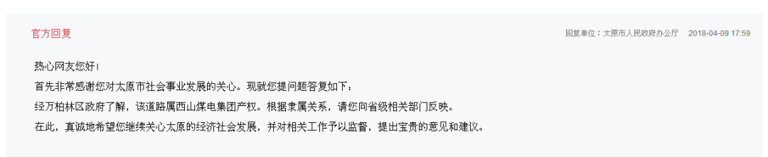 市长答复:经万柏林区政府了解,该道路属西山煤电集团产权。根据隶属关系,请您向省级相关部门反映。