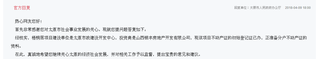 市长答复:经核实,梧桐居项目建设单位是太原市政建设开发中心,投资商是山西银丰房地产开发有限公司,现该项目不动产证的初始登记证已办,正准备分户不动产证的资料。