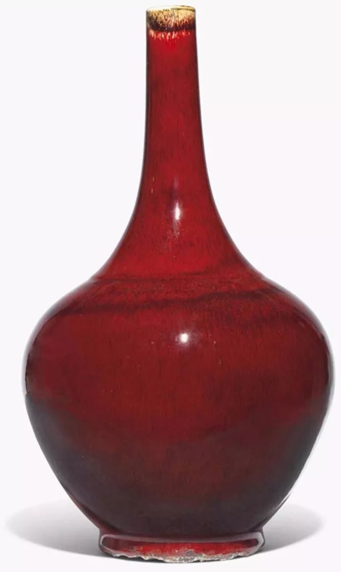 张为君:红釉还有不少名称,例如“苹果红”“美人霁”“娃娃脸”“美人醉”等,描述酷似嫰红肤色的色调。红釉瓷深受藏家喜爱,带有绿色斑点的珍品则更受欢迎。要塑造这种翠绿的效果,必须准确涂上含铜的彩釉,然后再小心烧制。这种彩釉在康熙年间独有,通常用于小型瓷器,例如文房摆设。