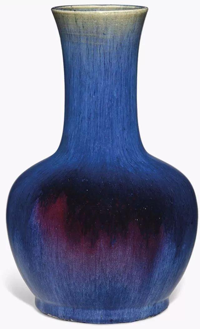 张为君:窑变是以高温焙烧而成的蓝、紫、红色彩釉。因为彩釉中的铜或其他金属成份在稀薄的彩釉表面分解,因此形成幻彩的效果,成就独特的窑变釉瓷。即使瓷器的外形一样,亦无法找到两件完全一样的窑变釉瓷,因为窑变釉无法控制,因此更加引人入胜。虽然窑变釉瓷展现抽象美感,但市场价格却不如装饰精致的明清御瓷。窑变釉具有独特的抽象美态,它虽非典型的中国彩釉,但其色调亮丽,是我最喜欢的彩釉之一,应该得到更高的评价。