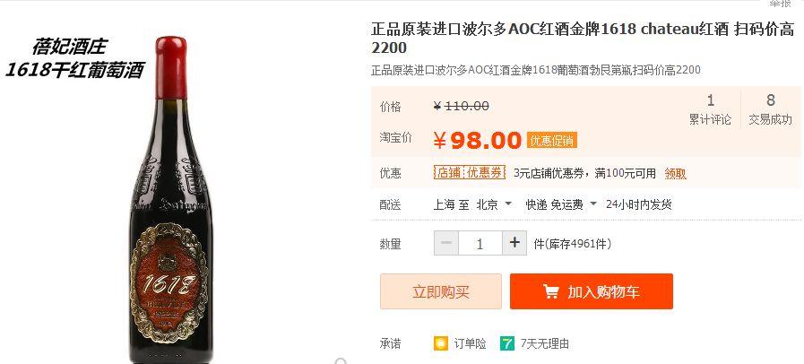 在阿里巴巴平台,“富葡进出口贸易有限公司”一款售价为15元/瓶的“法国原酒进口干红葡萄酒”,明确打出“红酒高扫码价1980元”的宣传语。在淘宝网上,一款售价为110元的“正品原装进口波尔多AOC红酒金牌1618”,宣称“扫码价2200元”。