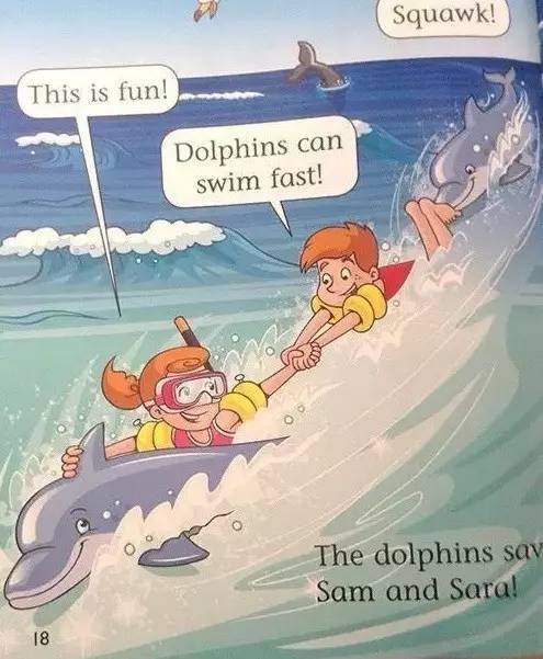 海豚让山姆和塞拉抓住自己,带着他们游回了海滩。