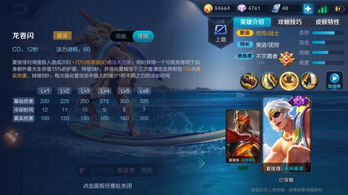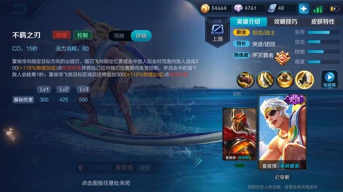 夏侯惇是一名边路非常强的战士,不仅控制稳定而且伤害也不低,续航能力也不错,如果能打出完美的combo(连招)可以轻松秒掉一个脆皮。