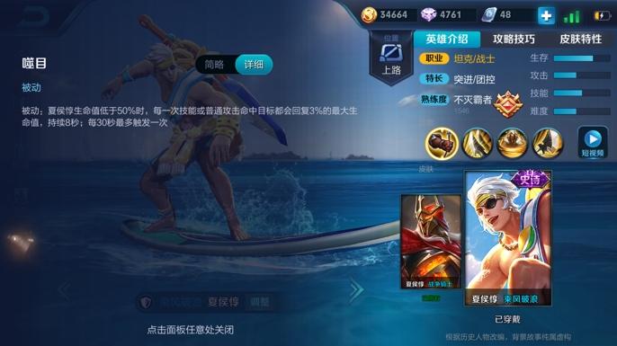 被动:夏侯惇血量低于50%时,普攻和技能命中目标能恢复自身百分比血量,技能cd30秒。这个被动给予了夏侯惇强大的对拼能力,前期对线能增加solo强度,后期硬度上去之后打团能回复许多血量。
