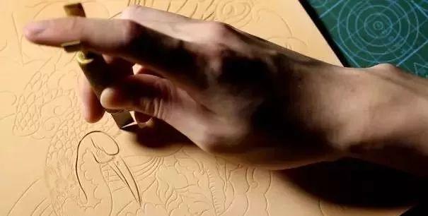 简单的线条勾勒后,关键的一步是用凿击的方式令花纹立体起来。这个技巧是令皮雕栩栩如生的关键。