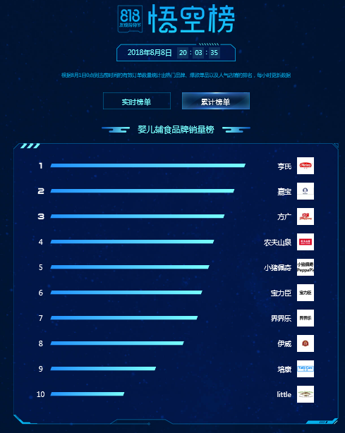 相较于母婴用品来说,婴儿辅食榜单排名则相对稳定。亨氏、嘉宝、方广、农夫山泉、小猪佩奇、宝力臣、界界乐、伊威、培康、little依次位列品牌销量榜TOP10。