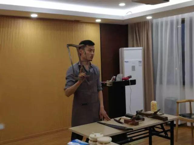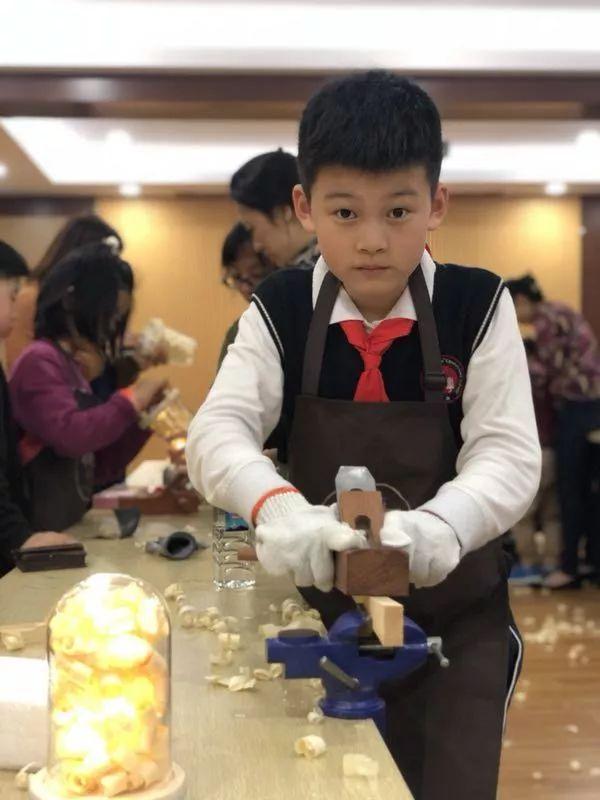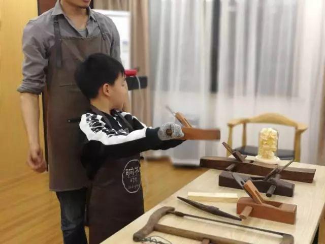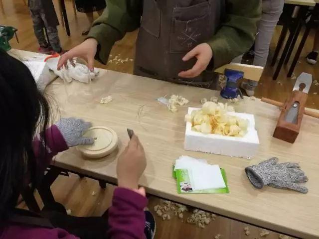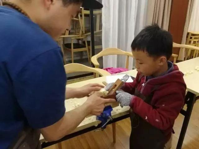 小朋友在家长的帮助下,兴致勃勃,一遍遍地刨着属于自己的一段小椴木。那认真的表情,俨然都是一个个小木匠。