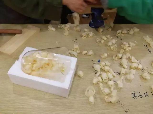 片刻的功夫,桌子上就堆满了刨花。这第二步就是挑出好的刨花装进灯罩里。
