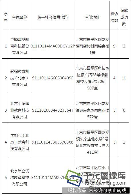 记者日前从昌平工商分局获悉,2018年上半年该局共接到消费者教育培训服务类投诉112件,投诉问题主要集中在合同和售后服务方面。中腾建华教育科技股份有限公司、聚招教育科技(北京)有限公司、北京中腾建业教育科技有限公司、学知心(北京)教育科技有限公司、北京昂立优培教育科技有限公司等五家培训机构多次被消费者投诉,工商部门决定对这五家机构进行公示,以提醒消费者在报名参加培训前,注意防范消费风险。