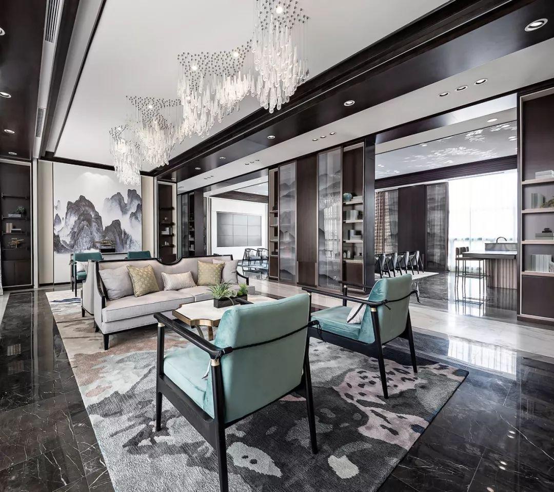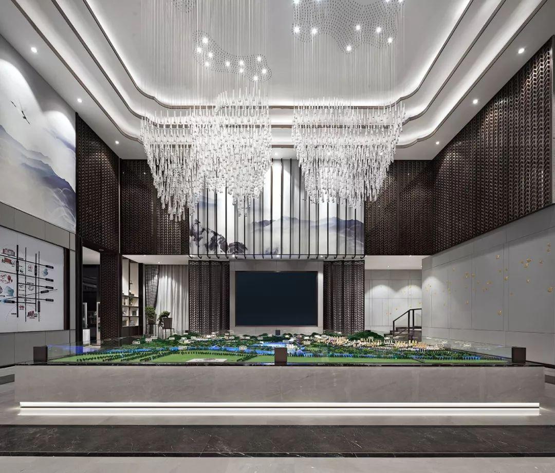室内空间布局延续建筑的轴线关系,对称的格局营造出强烈的仪式感,入口区域的景观,融合昭山元素和山水的意象,将山水与人文创造一种艺术性地连接。立面空间的分割伴随着光的洗涤和晕染效果,营造出鲜明的层次感,极具视觉冲击力。并通过“山水画”及演变简约化的博古架来营造空间层次感,独具质感的鱼骨镂空屏风也使各空间相互渗透,虚实穿插,端庄丰华中透着柔情;沙盘上方特制水晶片灯在光的作用下,显得精致、温暖。纵横交错的无数水晶片似山的叠嶂似水的柔美,高低错落中,呈现飘渺山水的灵动逸致,与墙面上艺术山水绘画交相呼应。