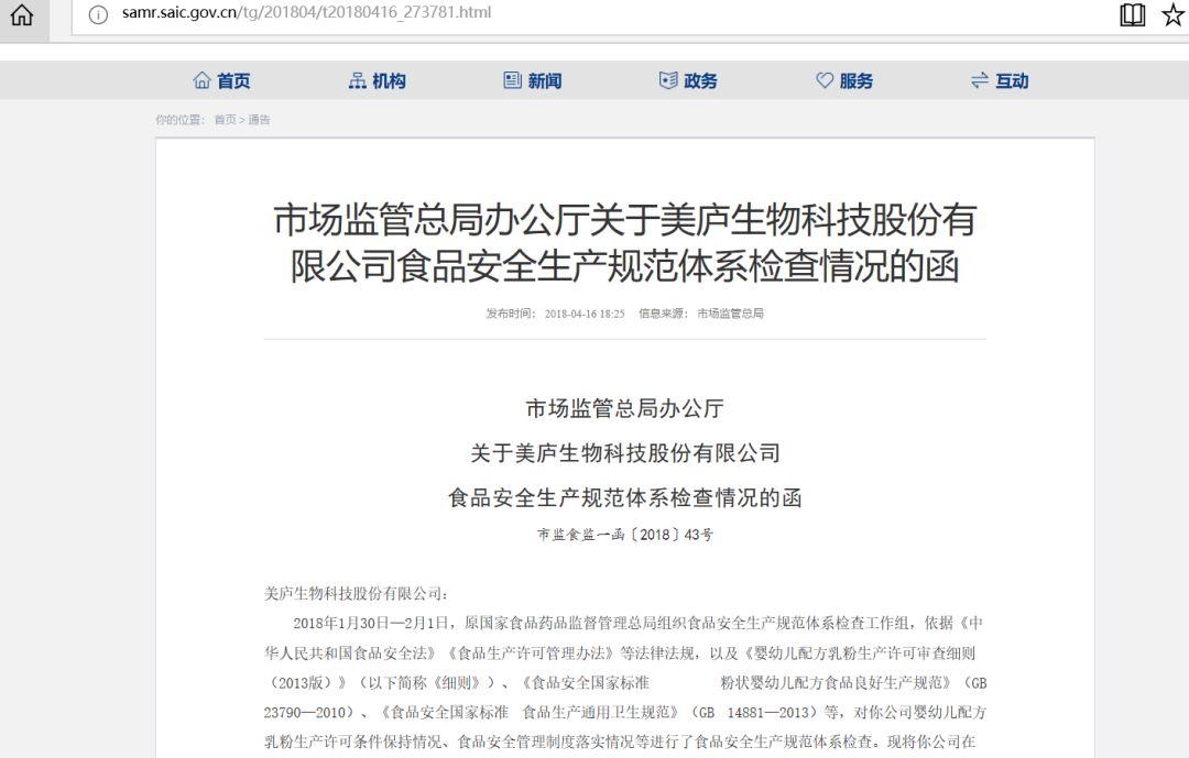 2018年1月30日—2月1日,原国家食品药品监督管理总局组织食品安全生产规范体系检查工作组,依据有关规定等,对美庐生物科技股份有限公司(下称“美庐生物”)婴幼儿配方乳粉生产许可条件保持情况、食品安全管理制度落实情况等进行了食品安全生产规范体系检查。