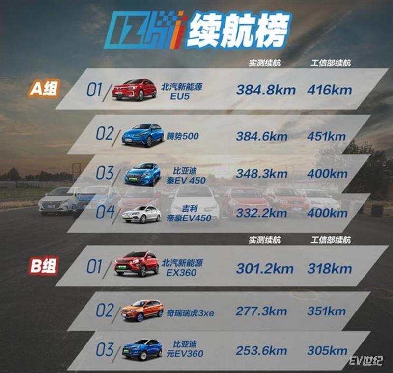 在续航里程测试环节中,活动方将7款2018年最新上市的家用电动车,按照工信部公布的续航里程划分为了A、B两组。A组是由北汽新能源EU5、比亚迪秦EV 450、吉利帝豪EV450以及腾势500组成的450km组;B组则是由北汽新能源EX360、比亚迪元EV360以及奇瑞瑞虎3xe组成的360km组。
